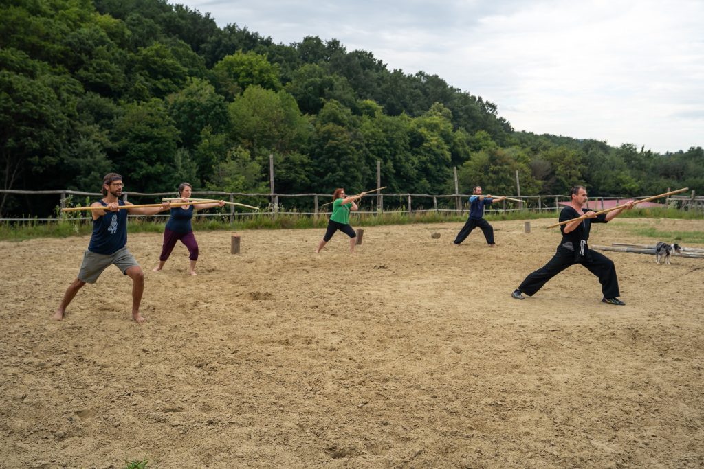 Szél-Tűz botforma (dinamikus, széles mozdulatok, mély állásból).